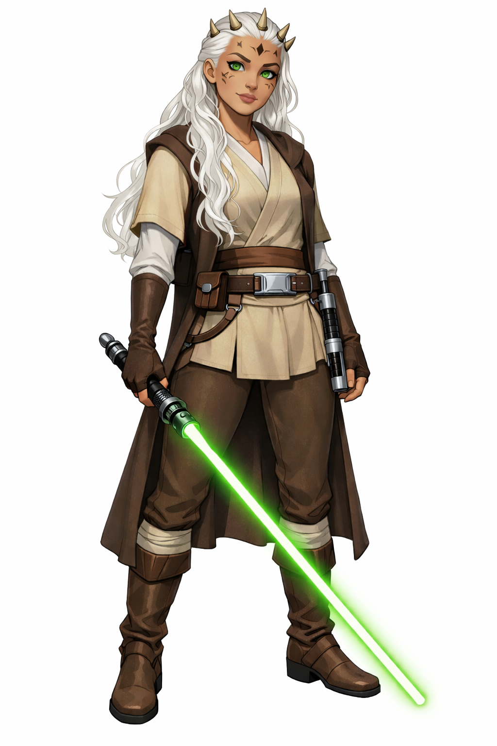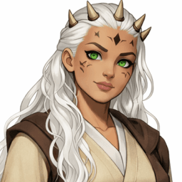 Si y a bien une chose que je ne supporte pas c'est le manque d'honneur, un combat pour moi c'est sacré. C'est un moment important et c'est aussi un dialogue avec la personne d'en face, on peut apprendre beaucoup de chose de son adversaire à travers un combat, la position de ses pas, sa garde indique si c'est plutôt une personne nerveuse ou confiante, sa carrure indique aussi quelques petites informations qui ne trompent pas, tout ça il faut avoir l'oeil. J'ai été entraînée des mon jeune âge par mon clan alors j'ai une carrure plutôt musclée et taillée, je fais 1m88 je pourrais être qualifiée de grande dame. J'ai des cheveux blancs assez longs, généralement je les laisses en queue de cheval c'est plus simple pour se battre. J'ai des yeux vert émeraudes et j'ai mes tatouages tribaux sur ma figure ce sont des symboles noirs assez neutres, j'ai la peau plutôt crème, et je porte une tenue de jedi classique la plus part du temps. Quand je suis dans mon temps libre, j'ai une tenue de civile sombre, pantalon noir, veste noire.